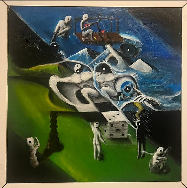 De twee peervormige gestalten, druppels van tijd of tranen van inzicht, symboliseren de Grote Transmutatie: de val die een opkomst wordt. Alles pulseert in een zachte, waterige wind.